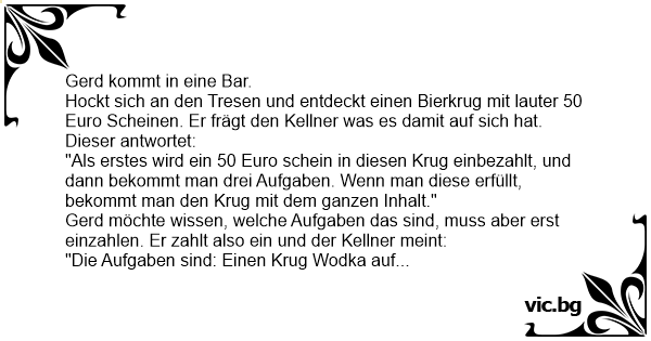 "Die Aufgaben sind: Einen Krug Wodka auf Ex auszutrinken, ohne das Gesicht zu verziehen und einen Laut von sich zu geben. In den kleinen Hinterhof neben der Kneipe gehen und dem Hund in der Hundehütte den Zahn ziehen. Im Oberen Stockwerk wohnt meine Oma die hatte noch nie nen richtigen Оrgаsмus. Und dass muss man ihr besorgen." Gerd lehnt doch ab und bestellt ein Bier. Nach einiger Zeit denkt er sich, dass er es ja mal probieren könnte. Allerdings muss er wieder einbezahlen. Er zahlt, bekommt einen Krug mit Wodka und trinkt aus, ohne das Gesicht zu verziehen und einen Laut von sich zu geben. Mit roten Kopf und schon ziemlich angetrunken geht er in den Hinterhof.