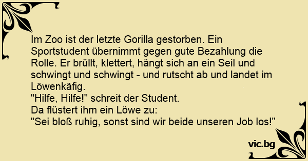 Im Zoo ist der letzte Gorilla gestorben. Ein Sportstudent übernimmt gegen gute Bezahlung die Rolle. Er brüllt, klettert, hängt sich an ein Seil und schwingt und schwingt - und rutscht ab und landet im Löwenkäfig.