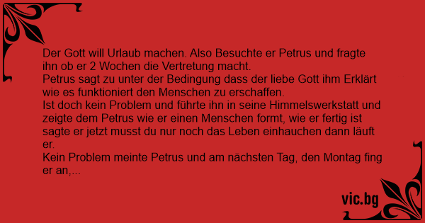 Der Gott will Urlaub machen. Also Besuchte er Petrus und fragte ihn ob er 2 Wochen die Vertretung macht.
