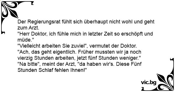 "Na bitte", meint der Arzt, "da haben wir's. Diese Fünf Stunden Schlaf fehlen Ihnen!"