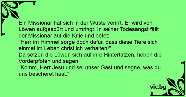 Ein Missionar hat sich in der Wüste verirrt. Er wird von Löwen aufgespürt und umringt. In seiner Todesangst fällt der Missionar auf die Knie und betet: "Herr im Himmel sorge doch dafür, dass diese Tiere sich einmal im Leben christlich verhalten!" Da setzen die Löwen sich auf ihre Hintertatzen, heben die Vorderpfoten und sagen: "Komm, Herr Jesu und sei unser Gast und segne, was du uns bescheret hast."