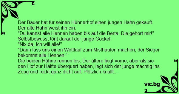 Die beiden Hähne rennen los. Der ältere liegt vorne, aber als sie den Hof zur Hälfte überquert haben, legt sich der junge mächtig ins Zeug und rückt ganz dicht auf. Plötzlich knallt es, und der junge Hahn fällt tot um. Der Bauer nimmt sein Gewehr von der Schulter und meint verwundert: