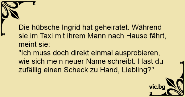 Die hübsche Ingrid hat geheiratet. Während sie im Taxi mit ihrem Mann nach Hause fährt, meint sie: