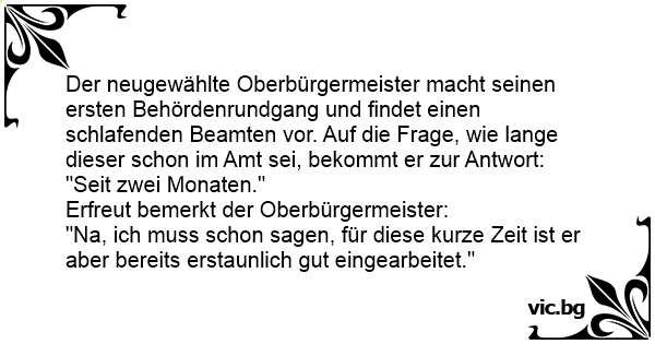 Der neugewählte Oberbürgermeister macht seinen ersten Behördenrundgang und findet einen schlafenden Beamten vor. Auf die Frage, wie lange dieser schon im Amt sei, bekommt er zur Antwort: