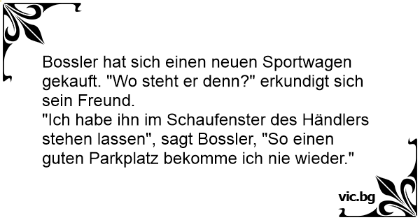 Bossler hat sich einen neuen Sportwagen gekauft. "Wo steht er denn?" erkundigt sich sein Freund.