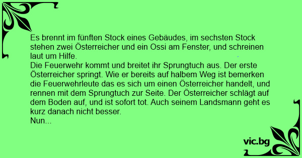 Die Feuerwehr kommt und breitet ihr Sprungtuch aus. Der erste Österreicher springt. Wie er bereits auf halbem Weg ist bemerken die Feuerwehrleute das es sich um einen Österreicher handelt, und rennen mit dem Sprungtuch zur Seite. Der Österreicher schlägt auf dem Boden auf, und ist sofort tot. Auch seinem Landsmann geht es kurz danach niсhт besser.