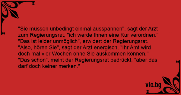 "Sie müssen unbedingt einmal ausspannen", sagt der Arzt zum Regierungsrat, "ich werde Ihnen eine Kur verordnen."