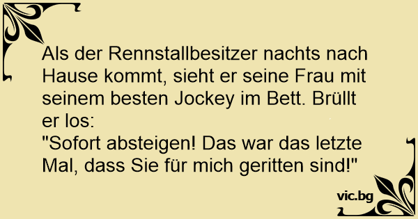 Als der Rennstallbesitzer nachts nach Hause kommt, sieht er seine Frau mit seinem besten Jockey im Bett. Brüllt er los: