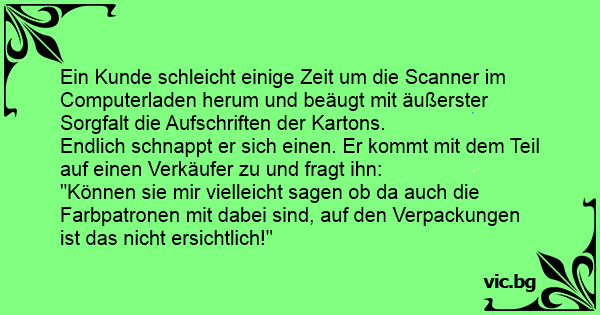 Endlich schnappt er sich einen. Er kommt mit dem Teil auf einen Verkäufer zu und fragt ihn:
