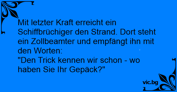 Mit letzter Kraft erreicht ein Schiffbrüchiger den Strand. Dort steht ein Zollbeamter und empfängt ihn mit den Worten: "Den Trick kennen wir schon - wo haben Sie Ihr Gepäck?"