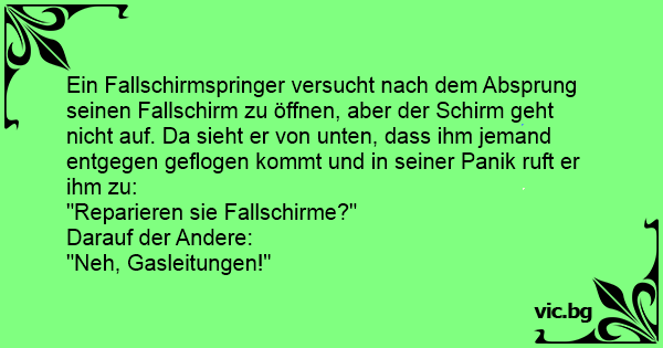 Ein Fallschirmspringer versucht nach dem Absprung seinen Fallschirm zu öffnen, aber der Schirm geht niсhт auf. Da sieht er von unten, dass ihm jemand entgegen geflogen kommt und in seiner Panik ruft er ihm zu: