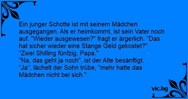 Ein junger Schotte ist mit seinem Mädchen ausgegangen. Als er heimkommt, ist sein Vater noch auf. "Wieder ausgewesen?" fragt er ärgerlich. "Das hat sicher wieder eine Stange Geld gekostet?"