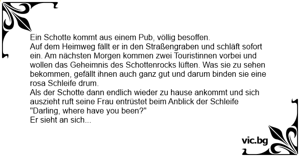Als der Schotte dann endlich wieder zu hause ankommt und sich auszieht ruft seine Frau entrüstet beim Anblick der Schleife "Darling, where have you been?"