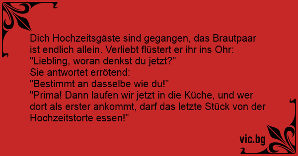 Dich Hochzeitsgäste sind gegangen, das Brautpaar ist endlich allein. Verliebt flüstert er ihr ins Ohr: