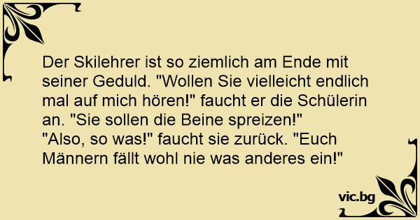 Der Skilehrer ist so ziemlich am Ende mit seiner Geduld. "Wollen Sie vielleicht endlich mal auf mich hören!" faucht er die Schülerin an. "Sie sollen die Beine spreizen!"