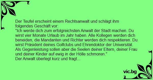 Ein Anwalt hat mit seiner Kanzlei Anlaufschwierigkeiten, und da beschwört er den Teufel. Der kommt auch promt, und sagt: "Diese Woche haben wir ein Sonderangebot: Du kriegst perfekte Gesundheit, gewinnst jeden Prozess, bist für Frauen unwiderstehlich,...
