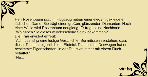 Herr Rosenbaum sitzt im Flugzeug neben einer elegant gekleideten jüdischen Dame. Sie trägt einen großen, glänzenden Diamanten. Nach einer Weile wird Rosenbaum neugierig. Er fragt seine Nachbarin: