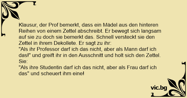 Klausur, der Prof bemerkt, dass ein Mädel aus den hinteren Reihen von einem Zettel abschreibt. Er bewegt sich langsam auf sie zu doch sie bemerkt das. Schnell versteckt sie den Zettel in ihrem Dekollete. Er sagt zu ihr: