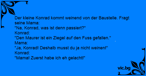 Der kleine Sohn kommt weinend zur Mutter: "Papi hat sich mit dem Hammer auf den Daumen geschlagen!" Die Mutter erstaunt: "Deshalb brauchst du doch nicht zu weinen!" Der Sohn: "Erst habe ich ja...