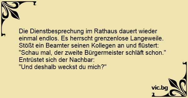 Die Dienstbesprechung im Rathaus dauert wieder einmal endlos. Es herrscht grenzenlose Langeweile. Stößt ein Beamter seinen Kollegen an und flüstert:
