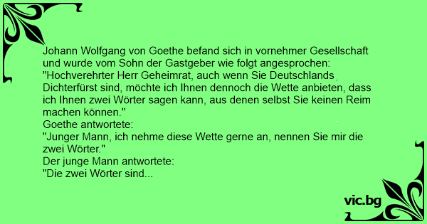 "Hochverehrter Herr Geheimrat, auch wenn Sie Deutschlands Dichterfürst sind, möchte ich Ihnen dennoch die Wette anbieten, dass ich Ihnen zwei Wörter sagen kann, aus denen selbst Sie keinen Reim machen können."