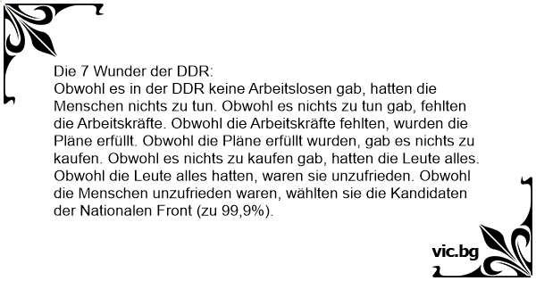 Obwohl es in der DDR keine Arbeitslosen gab, hatten die Menschen nichts zu tun. Obwohl es nichts zu tun gab, fehlten die Arbeitskräfte. Obwohl die Arbeitskräfte fehlten, wurden die Pläne erfüllt. Obwohl die Pläne erfüllt wurden, gab es nichts zu kaufen. Obwohl es nichts zu kaufen gab, hatten die Leute alles. Obwohl die Leute alles hatten, waren sie unzufrieden. Obwohl die Menschen unzufrieden waren, wählten sie die Kandidaten der Nationalen Front (zu 99,9%).