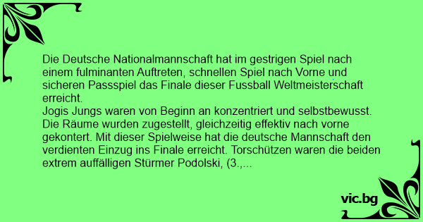 Die Deutsche Nationalmannschaft hat im gestrigen Spiel nach einem fulminanten Auftreten, schnellen Spiel nach Vorne und sicheren Passspiel das Finale dieser Fussball Weltmeisterschaft erreicht.