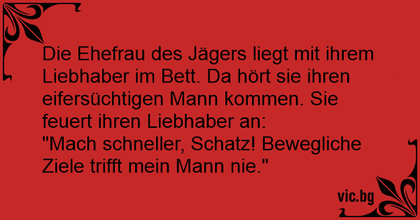 Die Ehefrau des Jägers liegt mit ihrem Liebhaber im Bett. Da hört sie ihren eifersüchtigen Mann kommen. Sie feuert ihren Liebhaber an: