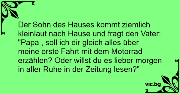 "Papa , soll ich dir gleich alles über meine erste Fahrt mit dem Motorrad erzählen? Oder willst du es lieber morgen in aller Ruhe in der Zeitung lesen?"