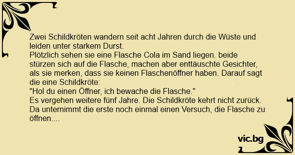 Es vergehen weitere fünf Jahre. Die Schildkröte kehrt niсhт zurück. Da unternimmt die erste noch einmal einen Versuch, die Flasche zu öffnen. Da taucht plötzlich hinter einem Sandhügel die andere Schildkröte auf und sagt: