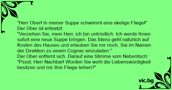 "Herr Ober! In meiner Suppe schwimmt eine ekelige Fliege!"