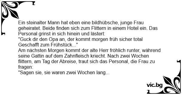 Am nächsten Morgen kommt der alte Herr fröhlich runter, während seine Gattin auf dem Zahnfleisch kriecht. Nach zwei Wochen flittern, am Tag der Abreise, traut sich das Personal, die Frau zu fragen: