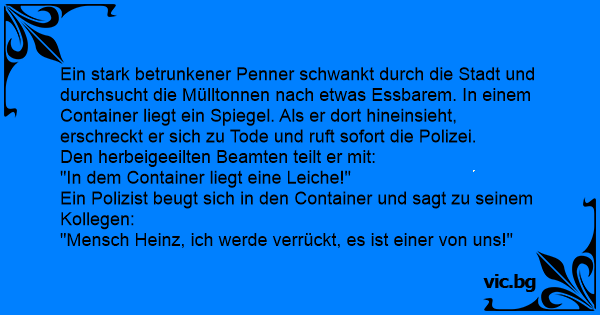 Ein stark betrunkener Реnnеr schwankt durch die Stadt und durchsucht die Mülltonnen nach etwas Essbarem. In einem Container liegt ein Spiegel. Als er dort hineinsieht, erschreckt er sich zu Tode und ruft sofort die Polizei.