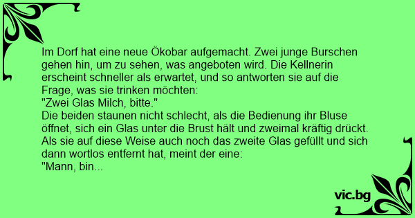 Die beiden staunen niсhт schlecht, als die Bedienung ihr Bluse öffnet, sich ein Glas unter die Brust hält und zweimal kräftig drückt. Als sie auf diese Weise auch noch das zweite Glas gefüllt und sich dann wortlos entfernt hat, meint der eine: