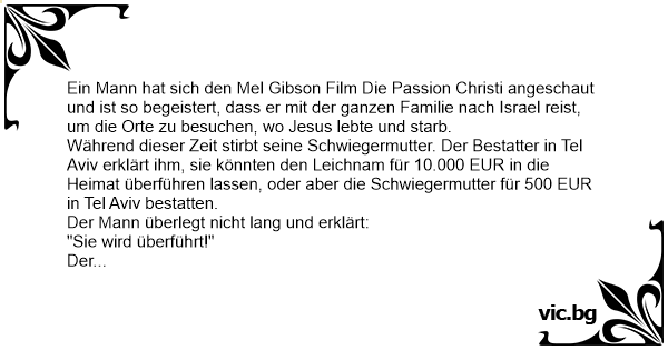 Während dieser Zeit stirbt seine Schwiegermutter. Der Bestatter in Tel Aviv erklärt ihm, sie könnten den Leichnam für 10.000 EUR in die Heimat überführen lassen, oder aber die Schwiegermutter für 500 EUR in Tel Aviv bestatten.