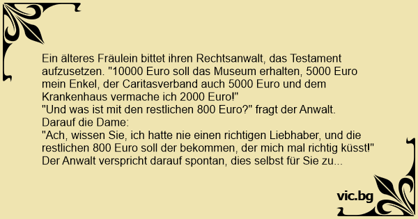 Ein älteres Fräulein bittet ihren Rechtsanwalt, das Testament aufzusetzen. "10000 Euro soll das Museum erhalten, 5000 Euro mein Enkel, der Caritasverband auch 5000 Euro und dem Krankenhaus vermache ich 2000 Euro!"