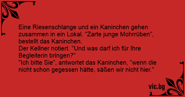 Eine Riesenschlange und ein Kaninchen gehen zusammen in ein Lokal. "Zarte junge Mohrrüben", bestellt das Kaninchen.