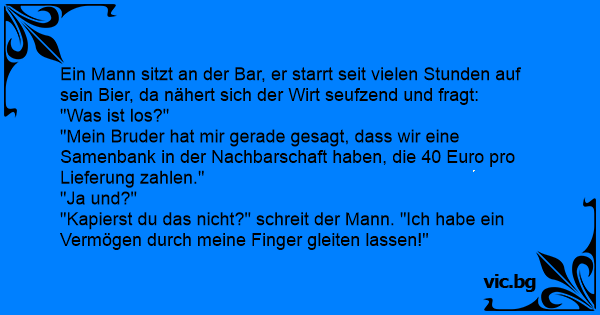 Ein Mann sitzt an der Bar, er starrt seit vielen Stunden auf sein Bier, da nähert sich der Wirt seufzend und fragt: