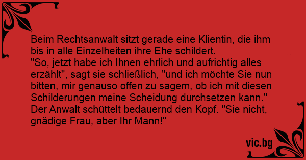 Der Anwalt schüttelt bedauernd den Kopf. "Sie niсhт, gnädige Frau, aber Ihr Mann!"