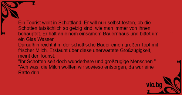 Ein Tourist weilt in Schottland. Er will nun selbst testen, ob die Schotten tatsächlich so geizig sind, wie man immer von ihnen behauptet. Er hält an einem einsamem Bauernhaus und bittet um ein Glas Wasser.