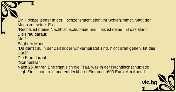 Nach 25 Jahren Ehe fragt sich die Frau, was in der Nachttischschublade liegt. Sie schaut rein und entdeckt drei Eier und 1500 Euro. Am Abend stellt sie ihren Mann zur Rede. "Du, hör mal Schatz, was haben eigentlich die drei Eier in deiner Nachttischschublade zu bedeuten?"