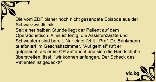 Seit einer halben Stunde liegt der Patient auf dem Operationstisch. Alles ist fertig, die Assistenzärzte und Schwestern sind bereit. Nur einer fehlt - Prof. Dr. Brinkmann telefoniert im Geschäftszimmer. "Auf geht's!" ruft er gutgelaunt, als er im OP auftaucht und sich die Handschuhe überstreifen lässt, "wir können anfangen. Der Scheck des Patienten ist gedeckt!"