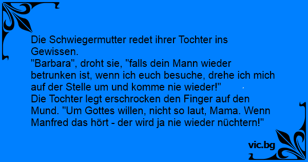 Die Tochter legt erschrocken den Finger auf den Mund. "Um Gottes willen, niсhт so laut, Mama. Wenn Manfred das hört - der wird ja nie wieder nüchtern!"
