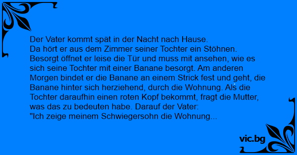 Da hört er aus dem Zimmer seiner Tochter ein Stöhnen. Besorgt öffnet er leise die Tür und muss mit ansehen, wie es sich seine Tochter mit einer Banane besorgt. Am anderen Morgen bindet er die Banane an einem Strick fest und geht, die Banane hinter sich herziehend, durch die Wohnung. Als die Tochter daraufhin einen roten Kopf bekommt, fragt die Mutter, was das zu bedeuten habe. Darauf der Vater: