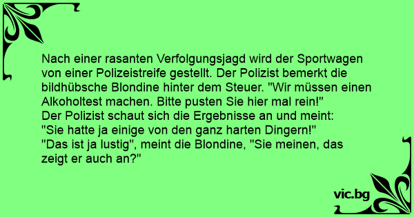 Nach einer rasanten Verfolgungsjagd wird der Sportwagen von einer Polizeistreife gestellt. Der Polizist bemerkt die bildhübsche Blondine hinter dem Steuer. "Wir müssen einen Alkoholtest machen. Bitte pusten Sie hier mal rein!"