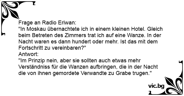 "Im Prinzip nein, aber sie sollten auch etwas mehr Verständniss für die Wanzen aufbringen, die in der Nacht die von ihnen gemordete Verwandte zu Grabe trugen."