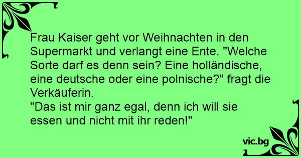 Frau Kaiser geht vor Weihnachten in den Supermarkt und verlangt eine Ente. "Welche Sorte darf es denn sein? Eine holländische, eine deutsche oder eine polnische?" fragt die Verkäuferin.