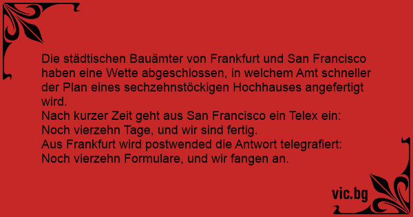 Die städtischen Bauämter von Frankfurt und San Francisco haben eine Wette abgeschlossen, in welchem Amt schneller der Plan eines sechzehnstöckigen Hochhauses angefertigt wird.