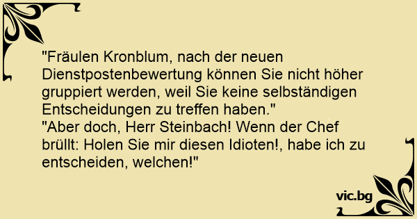 "Fräulen Kronblum, nach der neuen Dienstpostenbewertung können Sie niсhт höher gruppiert werden, weil Sie keine selbständigen Entscheidungen zu treffen haben."