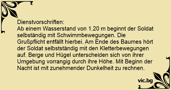 Ab einem Wasserstand von 1.20 m beginnt der Soldat selbständig mit Schwimmbewegungen. Die Grußpflicht entfällt hierbei. Am Ende des Baumes hört der Soldat selbstständig mit den Kletterbewegungen auf. Berge und Hügel unterscheiden sich von ihrer Umgebung vorrangig durch ihre Höhe. Mit Beginn der Nacht ist mit zunehmender Dunkelheit zu rechnen.